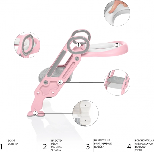 Dank der Höhenverstellbarkeit wachsen die Stufen mit Ihrem Kind mit, bis sie nicht mehr benötigt werden. Die stabile Konstruktion sorgt dafür, dass sich das Kind beim Hinaufsteigen und Sitzen sicher fühlt. Die Füße sind mit einer speziellen rutschfesten Schicht ausgestattet, die ein Gefühl von Stabilität und Halt gibt. Zum Lieferumfang gehört auch ein weicher und bequemer Sitz, der als Reduktion für die normale Toilette dient. Die anatomische Form des Sitzes zusammen mit der erhöhten Rückseite verhindert perfekt ein ungewolltes Verschmutzen.