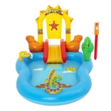 Das Spielcenter verbindet Wasserspaß mit Bewegung und Spielen: Kinder rutschen über die abnehmbare Rutsche, probieren das Ringwerfen auf ein Hufeisen und reiten auf dem aufblasbaren Pferd. Nach dem Spielen lassen Sie das Wasser einfach ab und das Becken ist schnell verstaut. Verpackt inklusive Reparaturflicken für längere Lebensdauer.