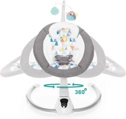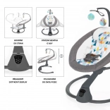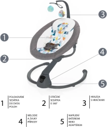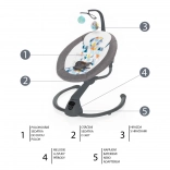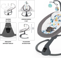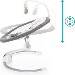 Das intuitive Touchpanel und die mitgelieferte Fernbedienung ermöglichen die bequeme Einstellung von Schaukelintensität (5 Stufen), Schaukelzeit (8/15/30 Min) und Lautstärke der Melodien. Das automatische Starten des Schaukelns bei Bewegungserkennung sorgt auch in anspruchsvolleren Momenten für Ruhe. Die üppige Polsterung, der 5-Punkt-Sicherheitsgurt und der Spielbogen mit zwei abnehmbaren Plüschspielzeugen gewährleisten Sicherheit und Freude.