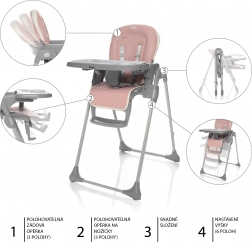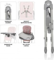 Das abnehmbare Tablett mit herausnehmbarer Einlage ist spülmaschinengeeignet, der abwischbare Bezug lässt sich leicht reinigen. Der 5-Punkt-Gurt hält das Kind sicher.