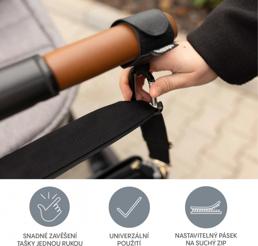 - Aufhängen von Taschen und Zubehör am Kinderwagengriff