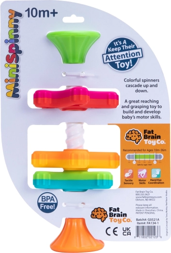 MiniSpinny ist ein cleveres, sensorisches Spielzeug, das Kinder durch Bewegung, Farben und Haptik fasziniert. Drei Scheiben mit unterschiedlicher Anzahl an „Füßchen“ drehen sich sanft am Spiralstab und erzeugen beim Hinabgleiten einen fesselnden visuellen Effekt. Strukturierte Oberflächen laden zum Entdecken ein und fördern spielerisch Tastsinn und Koordination.