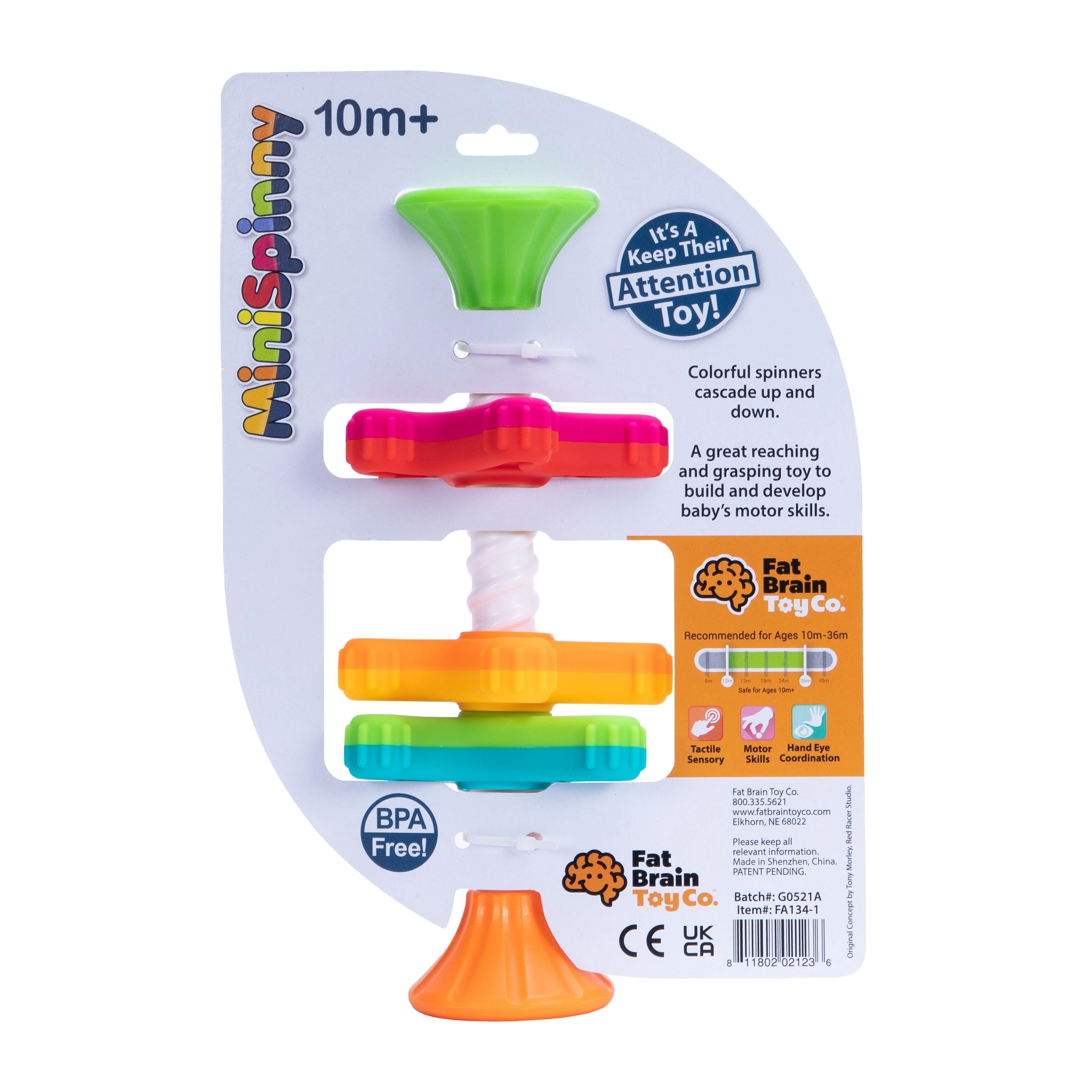 Dank der Saugfläche lässt sich das Spielzeug leicht auf Tisch, Hochstuhl-Tablett oder Fenster befestigen – nichts geht verloren und alle Teile bleiben beisammen. MiniSpinny ist perfekt für Zuhause, unterwegs und fürs Bad. Sicherer Kunststoff ohne BPA und Phthalate sorgt für unbeschwertes Spielen.