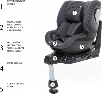 Der Autositz hat die anspruchsvollsten Tests in den Niederlanden bestanden, erfüllt die Norm ECE R129 i-Size und eignet sich für Kinder von Geburt an bis 105 cm Körpergröße bzw. 18 kg. Er ist vollständig drehbar (360 °), was nicht nur den Wechsel der Fahrtrichtung in allen 4 verstellbaren Positionen ermöglicht, sondern auch eine wesentlich bequemere Handhabung des Kindes beim Ein- und Aussteigen gewährleistet.