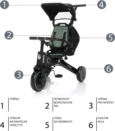 Das Dreirad ist faltbar und kompakt und passt daher in den Kofferraum oder auch in kleinere Flure. Die praktische abnehmbare Tasche und der Tragebeutel erleichtern das Reisen. Für Sicherheit sorgen der 5-Punkt-Gurt, der verstellbare Schutzbügel und die Bremse an den Hinterrädern.