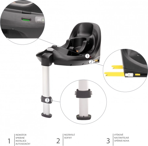 Unabhängige ISOFIX-Konnektoren mit Indikatoren ermöglichen eine einfache und sichere Installation des Autositzes im Fahrzeug. Der Autositz verfügt über einen Stützfuß, der einen zusätzlichen Auflagepunkt für mehr Stabilität bietet; auch der Stützfuß hat einen Indikator für die korrekte Einstellung. Für noch mehr Stabilität sorgt zudem der Sicherheitsbügel. Die korrekte Installation des Autositzes auf der Basis wird durch entsprechende Indikatoren bestätigt. Das Abnehmen des Autositzes von der Basis erfolgt einfach über die Verriegelung.
