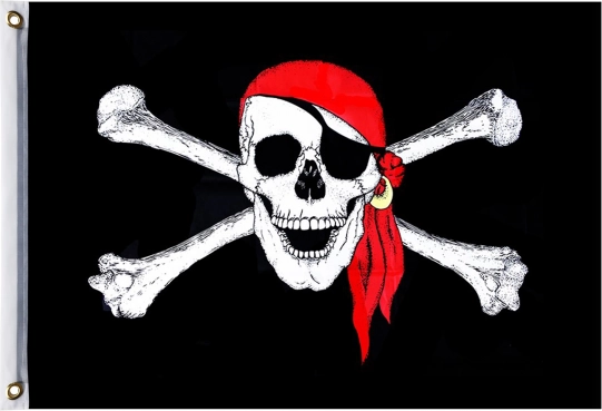 Entdecken Sie diese Piratenflagge mit furchteinflößendem Motiv für echte Piraten, ausgestattet mit Löchern für einfache Befestigung.