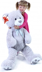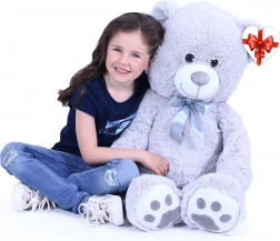 Der große graue Plüschbär mit einer Länge von ca. 100 cm begeistert durch seine Weichheit, Kuscheligkeit und hochwertige Verarbeitung. Die samtige Oberfläche lädt zum Schmusen ein, die satinierte Schleife verleiht einen eleganten Look und der Herzanhänger ermöglicht eine persönliche Botschaft – ideal für Geburtstage, Feiertage oder als Deko im Kinderzimmer.