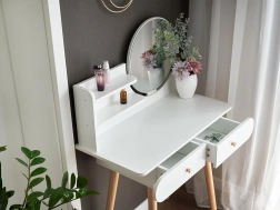 Der skandinavische Stil, den Designer bereits vor Jahren lieben gelernt haben, passt perfekt in jedes minimalistische Zimmer. Moderne Haushalte greifen immer häufiger zu dieser Möbelästhetik und schätzen ihren minimalistischen Charakter und die neutralen Farben. Daher fügt sich dieser Schminktisch ideal in dieses Ambiente ein. Sein schlichtes Design und die hellen Farben lassen ihn in jedem Raum gut wirken. Das Möbelstück besteht ausschließlich aus MDF-Holzplatte. Die Selbstmontage ist erforderlich und die Lieferung erfolgt mit einer ausführlichen, bebilderten Anleitung.