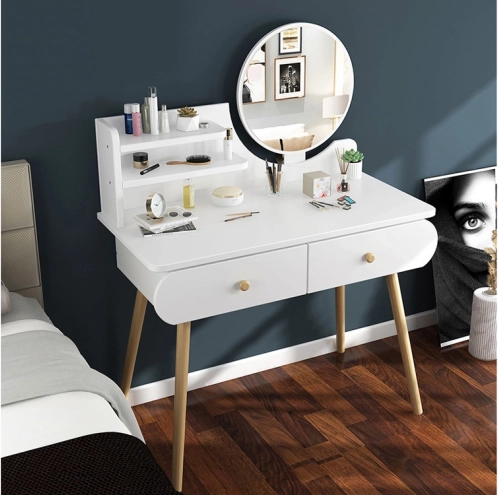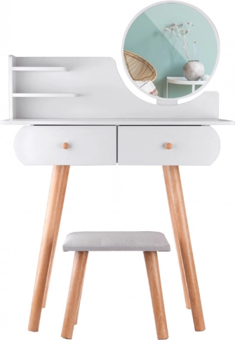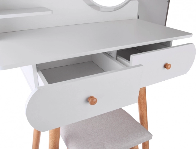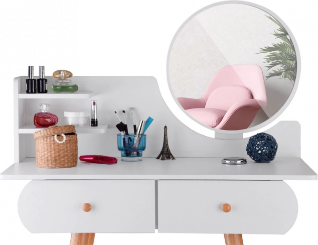 Funktionaler, minimalistischer Schminktisch im skandinavischen Stil kann eine großartige Ergänzung für ein Mädchenzimmer sein. Der weiße Schminktisch mit rundem Spiegel, geräumigen Schubladen und einem bequemen Hocker ist ideal zum Schminken, Haare kämmen, Outfit richten und sogar zum Tagebuchschreiben.