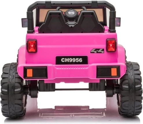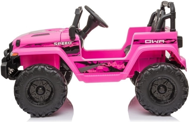 Das rosafarbene elektrische Auto im Offroad-Stil bietet Kindern eine sichere und unterhaltsame Fahrt im Garten oder auf dem Gehweg. Große schwarze Räder meistern Unebenheiten, während die realistische Front, Scheinwerfer und Armaturenelemente das Gefühl echten Fahrens verstärken. Dank der robusten Kunststoffkarosserie und stabilen Konstruktion ist das Auto für tägliche Abenteuer gerüstet.