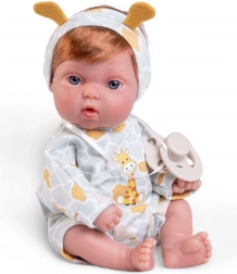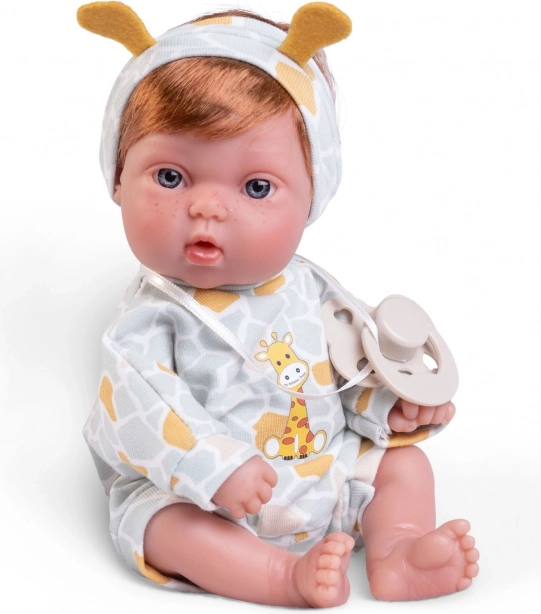 Die Puppe ist in einem niedlichen Giraffen-Outfit gekleidet, ergänzt durch ein Stirnband mit kleinen gelben Ohren und Schnuller, was ihrem realistischen Aussehen hinzufügt.