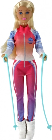 Die Puppe ist mit einem Skianzug, weißem Helm, weißen Winterstiefeln, Skiern und Stöcken ausgestattet. Das ist jedoch noch nicht alles! Zum Set gehören außerdem ein Ballerina-Kostüm (lila Outfit mit rosa Tüllrock, rosa Haargummi und weißen Ballettschuhen), ein Skateboard-Outfit (blaues Skateboard, gelbe Langarmbluse, blaue Hose, rosa Helm und rosa Sportschuhe) sowie ein Yoga-Outfit (bequeme orangefarbene Hose, buntes Kurzarmoberteil und mintfarbene Sportschuhe).