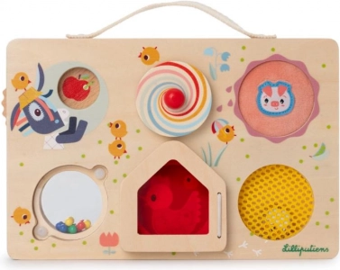 Das holzene Panel in Form eines Köfferchens mit beliebten Bauernhofmotiven, das sich leicht überallhin mitnehmen lässt, bietet eine unterhaltsame Möglichkeit für Kinder, die Welt zu entdecken. Dieses Panel ermöglicht es Kindern bereits ab einem Jahr, sich mit vielfältigen Aktivitäten zu beschäftigen, die nicht nur Spaß machen, sondern auch bilden.