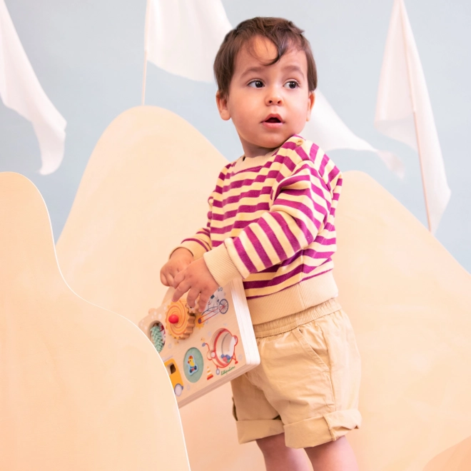 Wir präsentieren eine interaktive Holztafel in Kofferform mit beliebten Lilliputiens-Figuren. Diese Tafel wurde so gestaltet, dass Ihr Kind drehen, drücken, ziehen, schütteln und vielfältige Aktivitäten beobachten kann, die die kognitiven Fähigkeiten fördern.