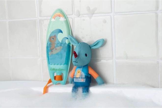 Das Surfbrett mit Wellen- und Regenbogenmotiven bringt die Atmosphäre von Strandabenteuern direkt in Ihr Badezimmer.