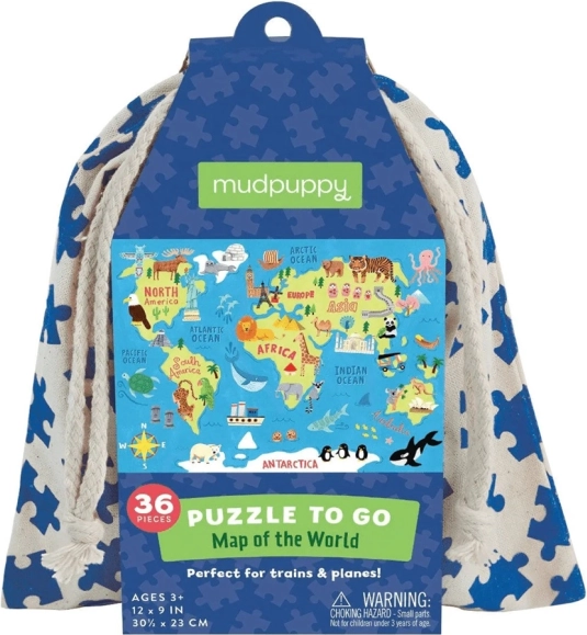 Mit dieser farbenfrohen Weltkarte tauchen Kinder in die Entdeckung der Kontinente und deren Bewohner ein. Jedes Puzzle besteht aus 36 Teilen, die aus recyceltem Papier gefertigt und mit ungiftigen Farben bedruckt sind. Verpackt in einem praktischen Baumwollbeutel mit schönem Aufdruck ist dieses Puzzle ideal für unterwegs und fördert die Feinmotorik. Alle Mudpuppy-Produkte entsprechen den Sicherheitsstandards CPSIA, ASTM und CE.
