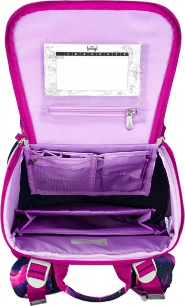 Aufklappmechanismus, Innenorganizer mit Gummiband, transparente Tasche für den Stundenplan und Seitentaschen für die Trinkflasche sorgen für perfekte Ordnung.