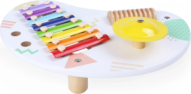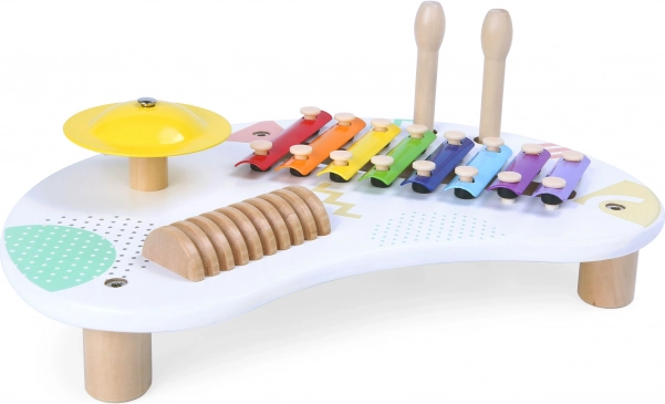 Der Musikspieltisch von ECOTOYS ist die ideale Wahl für kleine Musikerinnen und Musiker. Er bietet ein vielseitiges 8-töniges Xylophon, ein klar klingendes Becken und ein hölzernes Guiro für rhythmische Begleitungen. Mit den zwei Holzschlägeln probieren Kinder mühelos verschiedene Klangfarben aus und trainieren die Hand-Auge-Koordination.