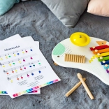 Ein farbiges Xylophon mit 8 Tönen, ein hell klingendes Becken und ein Holz-Guiro bieten eine vielfältige Klangpalette für erste Musik- und Rhythmusspiele.