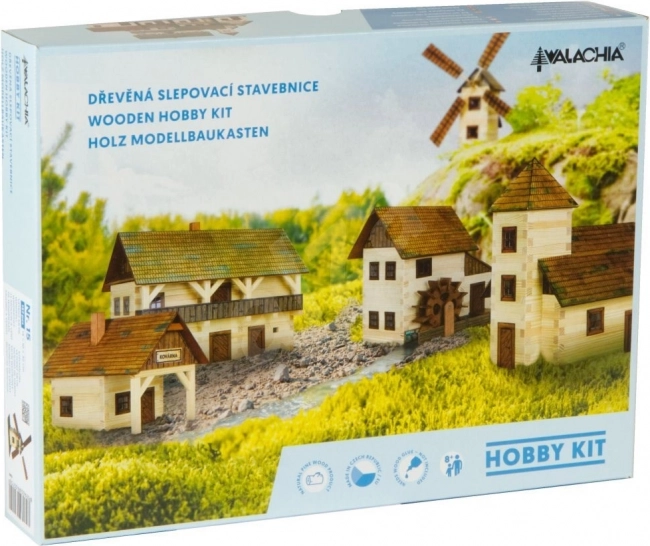 • Lieferumfang: Holzleisten in vorgegebenen Längen, Teile für Dächer und Giebel, Kartonausstanzungen für Fenster und Türen, vorgedruckte Papierdekore, schematischer Montageplan.