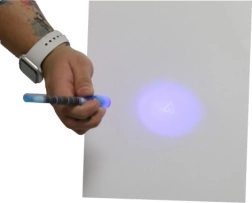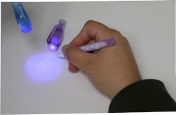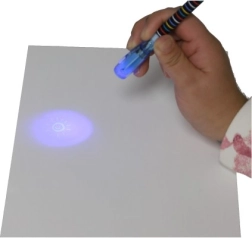 Eine Seite klassischer Kugelschreiber, die andere UV-Stift – wechsle in Sekunden zwischen normalem und geheimem Schreiben.