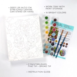 Im Paket finden Sie alles, was Sie brauchen: eine tiefe, gespannte Leinwand (8 × 10 Zoll), 16 Acrylfarben in Töpfchen, 2 Pinsel und eine einfache Anleitung. Einfach die Box öffnen und losmalen.