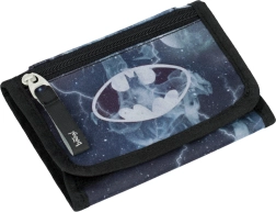 Die Geldbörse zeigt ein blau-schwarzes Motiv mit Rauch- und Nachtmustern, perfekt ergänzt durch das Batman-Zeichen.