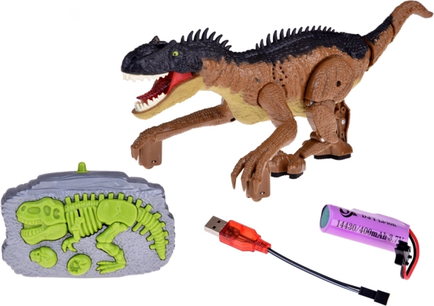 Der Dinosaurier arbeitet mit einem wiederaufladbaren Akku, der im Lieferumfang enthalten ist. Für die Fernbedienung werden 2 AA-Batterien benötigt (nicht im Lieferumfang enthalten). Der Dinosaurier hat bewegliche Gliedmaßen, die ihm realistische Bewegungen ermöglichen.