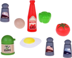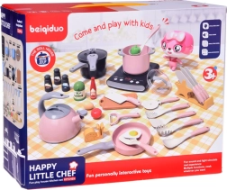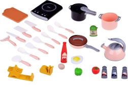 Das Set enthält alles, was kleine Köchinnen und Köche brauchen: Kocher, Geschirr, Küchenwerkzeuge sowie Lebensmittel und Gewürze.