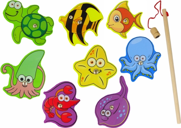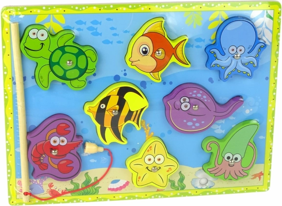 Das Holzset zum Fangen von Meerestieren ist mit einem schön illustrierten Brett ausgestattet, das den Meeresboden darstellt und einen faszinierenden Einblick in die Unterwasserwelt bietet. Die verschiedenen Holzfiguren der Tiere können spaßig platziert und dank eingebauter Magnete mit einer Holzangel gefangen werden.