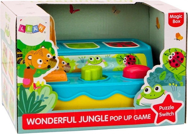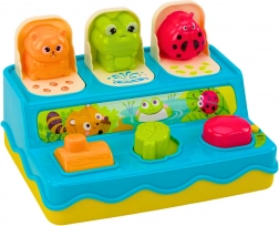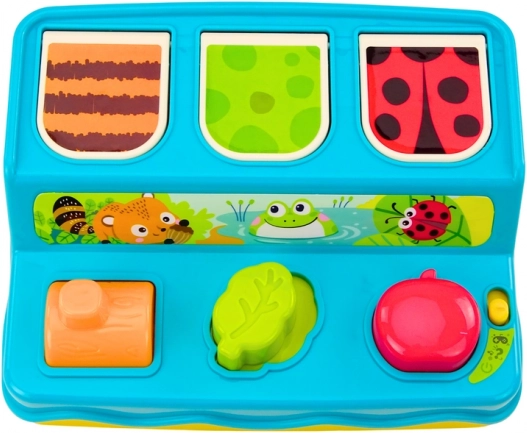 Das Spielzeug besteht aus einer stabilen, farbigen Basis mit verschiedenen Formen und Tasten. Jede Form stellt ein anderes Tier dar, und die Tasten dienen zu deren Aktivierung. Wenn das Kind eine bestimmte Form drückt oder bewegt, springt eines der drei Tierchen heraus, was das Kleinkind zu weiterem Entdecken anregt.