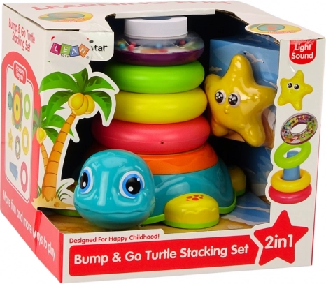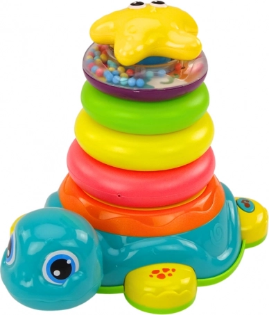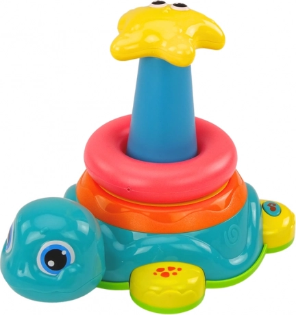 Pyramide Reitende Schildkröte 2-in-1 ist ein dynamisches Spielzeug, das Spaß mit Bildung kombiniert. Die Basis in Form einer reitenden Schildkröte reagiert auf Hindernisse und bietet Licht- und Soundeffekte, was das Spiel interaktiver macht.