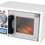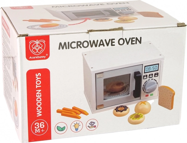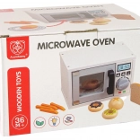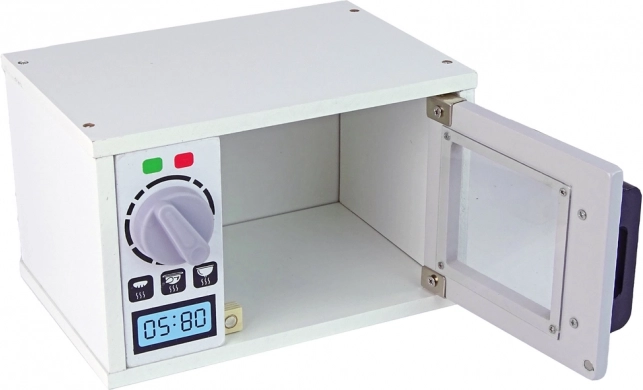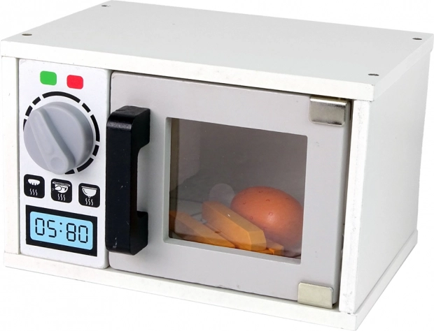 Diese Holz-Kindermikrowelle bietet realistische Details, die Kinder lieben: ein Drehknopf mit angenehmem Klicken, ein Aufdruck mit Display und Aufheizzeit sowie eine Magnettür für einfaches und sicheres Schließen. Dank der kompakten Maße passt sie perfekt in Spielecken und Spielküchen.