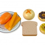 Teller, 2× Donut, Brötchen, Brotscheibe, 4× Pommes und Hähnchenkeule – alles bereit für kreatives Servieren und lustige Szenen.