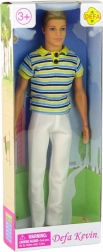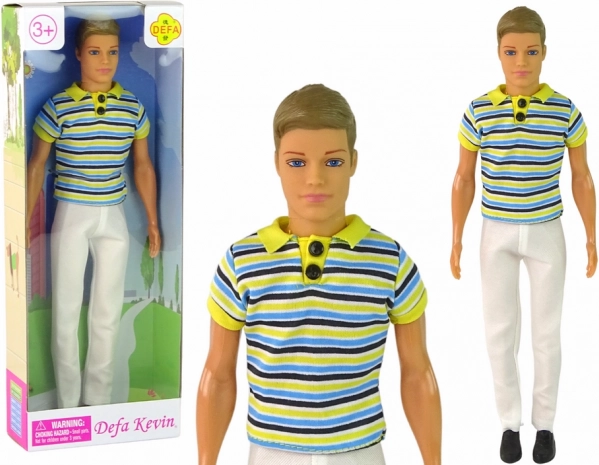 Lernen Sie einen liebenswerten Spielkameraden kennen. Puppe Kevin trägt weiße Hosen, schwarze Schuhe und ein bequemes Poloshirt mit gelb-blauen Streifen. Durch das realistische Aussehen mit blonden Haaren und blauen Augen erfinden Kinder leicht eigene Geschichten und lernen Empathie und Fürsorge.