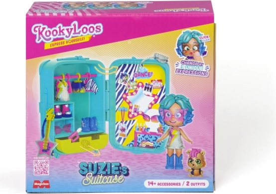 Seid ihr bereit für die Reise? Der KookyLoos-Koffer enthält alles, was ihr für jede Menge Spaß braucht. Es warten bis zu 4 Modelle zum Sammeln auf euch! Suzi ist eine echte Modekennerin. Ihr Haute-Couture-Outfit ist der neueste Pariser Modestil! Seid ihr bereit für eine Tour durch die Juweliergeschäfte am Place Vendôme und in der Rue Cambon? Aber ihr entscheidet, welches der zwei Outfits sie bei der neuesten Modenschau tragen wird! Sie hat außerdem drei verschiedene Gesichtsausdrücke, die ihr mit einem Klick wechseln könnt. Ihr könnt alles in den Koffer packen und mitnehmen! Der Koffer enthält – exklusive KookyLoos-Puppe, 2× Outfit, 1× Tierchen, über 13 Accessoires und Kleiderbügel.