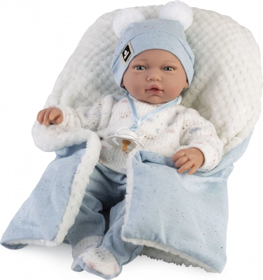 Realistische Babypuppe mit weichem Stoffkörper, der sich leicht positionieren lässt. Arme und Beine sind mit Gelenken befestigt, sodass die Puppe sitzen kann. Wird mit einem Schnuller als Zubehör geliefert.