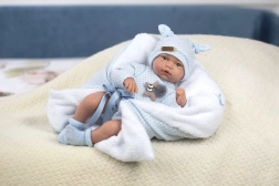 Die niedliche Babypuppe Hugo ist ideal für Kinder, die gerne spielen und sich um ihr eigenes 'Baby' kümmern möchten. Die Puppe gibt bei Druck auf die Brust authentische Geräusche eines lachenden Kindes von sich. Sie ist mit Gelenken ausgestattet, die das Bewegen von Armen und Beinen ermöglichen, und kann dank der Beweglichkeit auch sitzen.