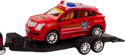 Das robuste rote Fahrzeug mit POLICE-Aufdruck und Lichtleiste (Dekor) meistert auch anspruchsvolle Missionen. Es rollt leicht vom Anhänger und ist sofort einsatzbereit.