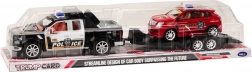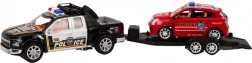 Der schwarze Pick-up zieht einen Anhänger mit rotem Geländewagen – die perfekte Kombination für Einsatz-, Abschlepp- und Verfolgungsszenen. Der Anhänger lässt sich jederzeit abkoppeln.