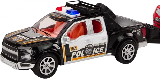 Dieses Polizei-Set kombiniert einen robusten schwarzen Pick-up mit Abschleppanhänger und ein rotes geländegängiges Polizeiauto. Große Räder sorgen für Stabilität; markante POLICE-Schriftzüge und die Lichtleiste (Dekor) verleihen einen realistischen Look. Der Anhänger ist abnehmbar und der Geländewagen kann die Rampe leicht auf- und abfahren – die Fahrzeuge lassen sich gemeinsam oder separat verwenden.