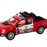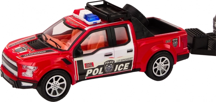 Der rote Pickup ist mit großen schwarzen Rädern ausgestattet, die Stabilität gewährleisten und das Ziehen des Anhängers mit dem Geländewagen erleichtern. Der Pickup hat ein realistisches Design und trägt die Aufschrift "POLICE" auf der Karosserie, was ihm Authentizität verleiht.