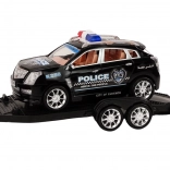 Auf dem Anhänger befindet sich ein schwarzes geländegängiges Polizeifahrzeug, das ebenfalls die Aufschrift "POLICE" auf der Karosserie trägt. Dieses Auto ist so gestaltet, dass es robust wirkt und einsatzbereit ist, sodass es ideal für das Spielen verschiedener Polizeiszenarien ist.