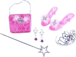 Schuhe, Handtasche, Stirnband mit Krone, Ohrringe, Zauberstab