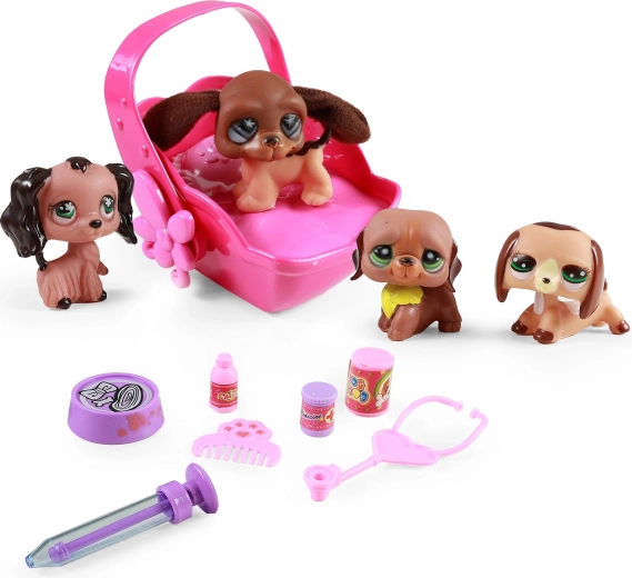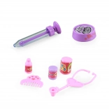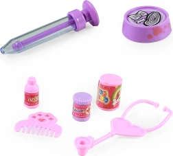 Das Set enthält verschiedene Werkzeuge wie Spritzen, Kamm, Stethoskop und mehr, alle in verschiedenen Farben. Perfekt zur Simulation der Pflege von Tieren.