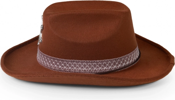 Verwandeln Sie den kleinen Cowboy im Handumdrehen in einen Sheriff. Der braune Hut mit stilvollem Band und glänzendem Sheriffstern sitzt dank des Gummibands sicher und passt auch bei actionreichem Spiel hervorragend.