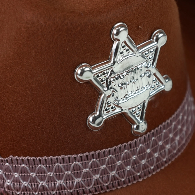 Stilvoller Kinder-Cowboyhut in brauner Farbe mit Sheriffstern und bequemem Gummiband unter dem Kinn – das ideale Accessoire für Karneval und Western-Rollenspiele.