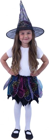Präsentieren Sie ein magisches Kostüm für kleine Hexen, das jedem Mädchen ein Lächeln ins Gesicht zaubert. Dieses Kostüm kombiniert einen schwarzen Hexenhut mit einem Rock verziert mit bunten Details, die an blühende Blumen erinnern.