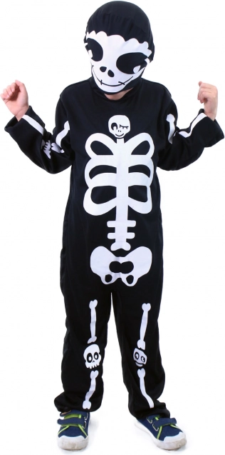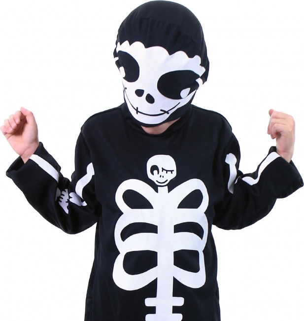 Verkleiden Sie Ihr Kind mit diesem gruseligen Skelett-Kostüm, ideal für Karneval oder Halloween. Das Kostüm in Größe M ist für Kinder im Alter von 6-8 Jahren (117-128 cm) geeignet. Es besteht aus einem schwarzen Overall und einer Maske mit weißem Skelettdruck.